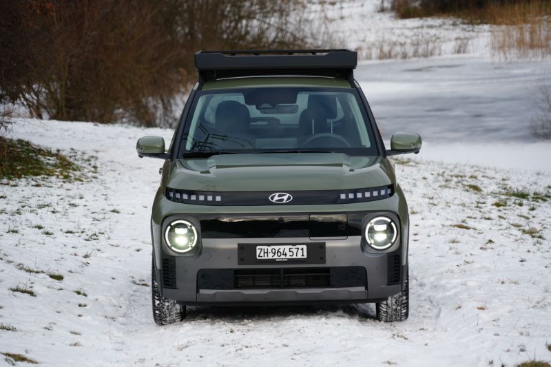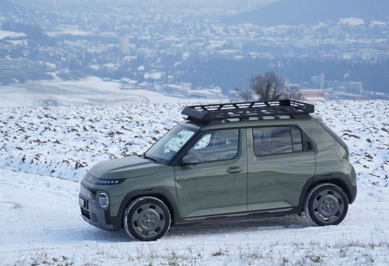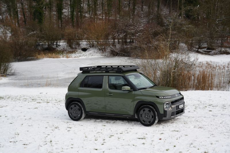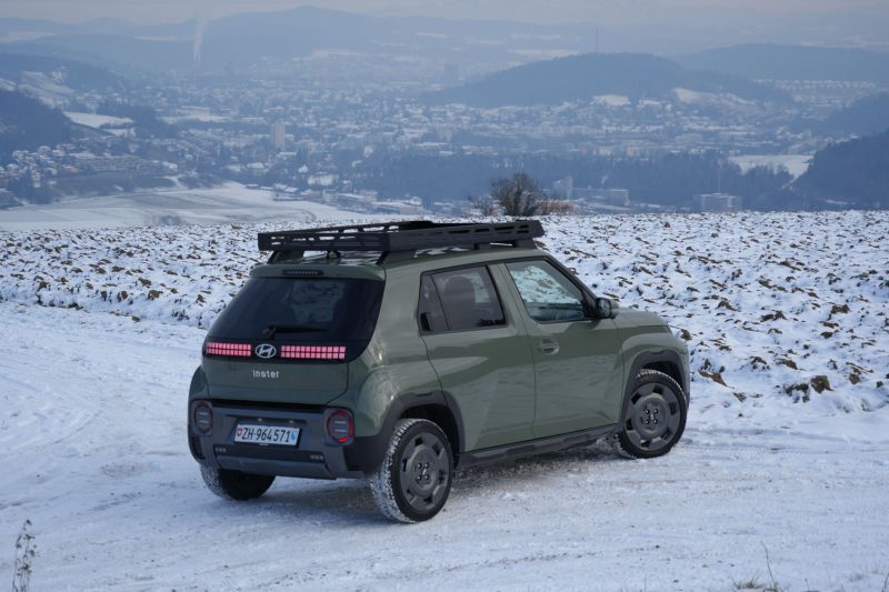 Mit 3,83 Metern Länge und rund 1,5 Tonnen Gewicht zeigt der Hyundai Inster, dass Elektromobilität nicht zwangsläufig in der 2,5-Tonnen-Klasse stattfinden muss. Und trotz den kompakten Abmessungen macht der E-SUV-Zwerg auch optisch etwas her. Besonders in der Speziallackierung «Amazonas Green Matte», 17-Zoll-Felgen und Transportkorb auf dem Dach.